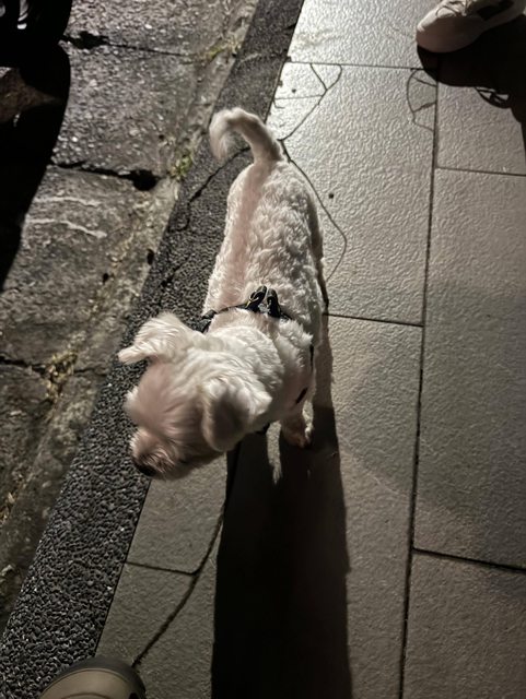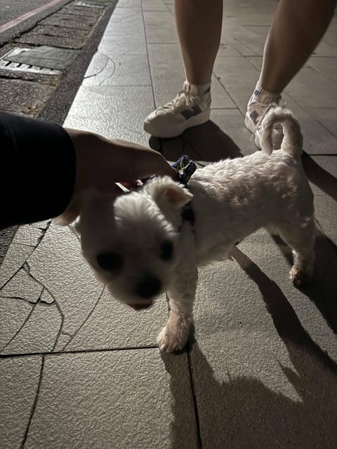 在小港區店中路186號星天地大樓一樓人行道,發現一隻很小的馬爾濟斯,男生,有胸背帶