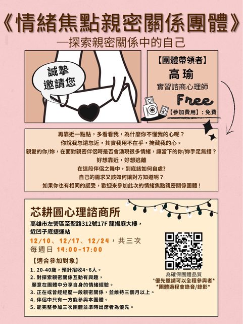 如果你也有相同的感受,歡迎來參加此次的情緒焦點親密關係團體 !