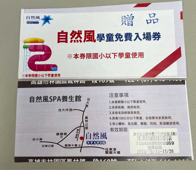 物品名稱:自然風學童免費入場券 2張,期限到期這個月 11/26(自然風spa養生館,溫
