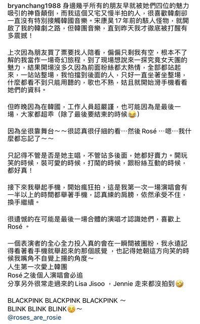 貼文中就提到,張書豪上次看BLACKPINK演唱會只是陪看,完全沒有接觸韓樂的他完全不了