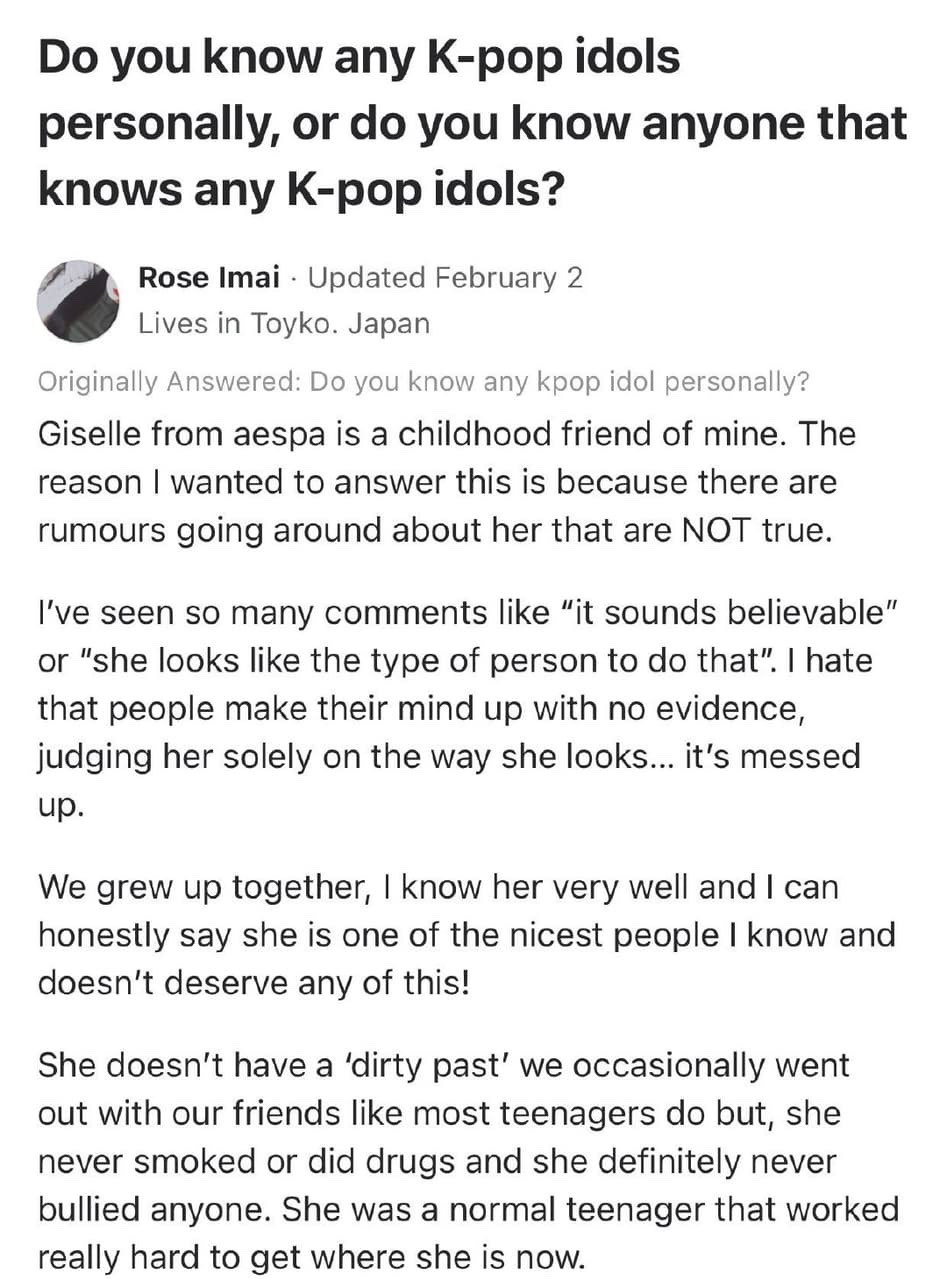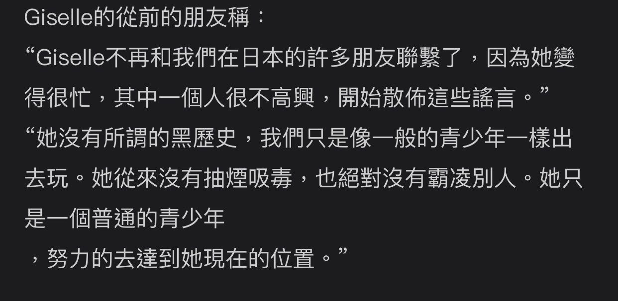 aespa Giselle 演唱途中突對觀眾席舉中指問候!真相曝光掀網論戰! https://cdn.kagit.kr/2023/10/06/webp_Giselle_12bf75ff84.webp kagit 人氣女團aespa才於上月30日完成了她們出道以來首度舉辦的巡迴演唱會。 怎料,最近網路社群中卻流出了日藉成員Giselle在某場演唱會中突舉中指的照片,引起網 友們熱議。 https://cdn.kagit.kr/2023/10/06/webp_Giselle_f391ab2404.webp 昨(5)日,有網友在討論區上分享了一則有關aespa成員Giselle的貼文。 內文中,貼出了最近在網路社群中瘋傳的aespa演唱會照片。 從照片可見,Giselle被現場粉絲拍到她突然向觀眾席舉出中指。 不過後來有網友解釋了Giselle當時因為看到自己朋友來看自己的演唱會,不自覺地向朋友 舉起了中指問候。 https://cdn.kagit.kr/2023/10/06/webp_Giselle_0764c9dcf3.webp 部分網友們得知真正原因後,紛紛表示「真的給Giselle笑死」、 「突然對她很有親近感耶」、「原來沒人氣也有好處,舉中指也不怕被罵,若是Karina或是 Winter應該被罵慘了」、 「沒錯!人氣成員呼吸也被罵」、「竟然在演唱會上看到Giselle生活上真實一面」、 「看來是僑胞,比較隨性吧」、「不虛偽蠻好啊」。 https://cdn.kagit.kr/2023/10/06/webp_Giselle_31478cfc50.webp 不過,同時也有網友認為Giselle這樣的舉動會影響隊友。 「她不是搞笑,是沒概念,沒考慮過隊友嗎」、「可能在富裕家庭長大,生活太自由都不管 形象了,但也要顧及其他成員啊」、 「如果在私人場合上舉中指沒問題,但是在粉絲面前展示,不太好吧」、「可以對自己職業 有點責任感嗎」、「不管多親近,這樣互相問候不好吧」等,指責的聲音。 https://cdn.kagit.kr/2023/10/06/webp_Giselle_e38059b42d.webp https://www.kagit.kr/posts/139656 -- ※ 發信站: 批踢踢實業坊(pttsite.org.tw), 來自: 1.200.25.49 (臺灣) ※ 文章網址: https://pttsite.org.tw/KoreaStar/M.1696572206.A.6B3