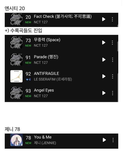 NCT 127、Jennie新歌Melon TOP100空降成績 (14:00) NCT 127 第20名 +)收錄曲也有進榜 Jennie 第78名 來源: theqoo https://theqoo.net/square/2955488043 1. Space真的很好聽 2. 127真的連收錄曲都很好聽 3. Angel Eyes超好聽,大家一定要聽聽看 4. 哇,兩個都好厲害啊 5. 感覺NCT這次的歌曲真的很好聽 6. IVE沒進榜有點意外,我還以為她們發歌不會受到時間限制,而且一定會空降很高的名次 的說,經紀公司到底做了什麼? 根本一點宣傳都沒有吧 7. Fact check一直在我耳邊揮之不去.. 8. Jennie的歌曲甚至沒宣傳耶 真的很好聽 9. Jennie的是歌曲發行前兩天才突然發佈公告的,原本都沒有期待會進榜的說,好幸福啊 也恭喜127 10. Jennie不愧是Jennie 11. 現在對IVE來說是很重要的時機,但是好像失誤了。既然出歌的時間是針對Billboard, 那為什麼不宣傳? 大家連出新歌了都不知道 12. Fact check fact check重複的那個part聽了真的很high 13. 週五13點出歌要進上位圈真的很難,防彈和NewJeans是天界啊 14. 127的歌好好聽 15. 因為星期五13點是沒有粉絲刷榜也沒有路人聽歌的時段,所以比原來的成績少了一半, 但大家的成績都還是不錯 (轉載請註明 韓網評論翻譯站,謝謝~) -- ※ 發信站: 批踢踢實業坊(pttsite.org.tw), 來自: 223.138.249.29 (臺灣) ※ 文章網址: https://pttsite.org.tw/KoreaStar/M.1696597023.A.AFF