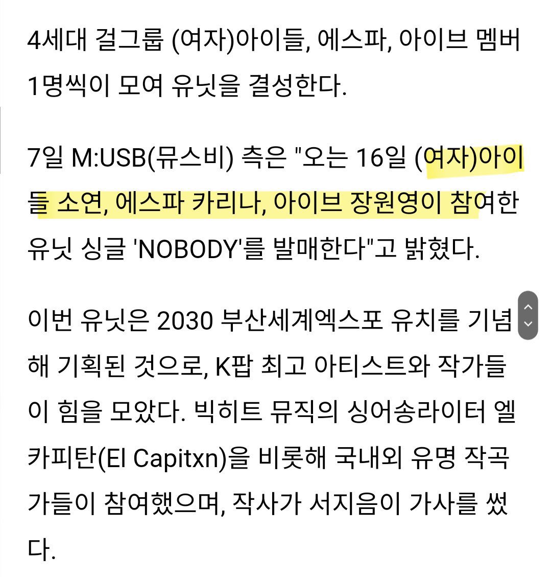 2023.11.16 6PM(韓國時間) 官方ig: https://instagram.com/m._.usb?igshid=MTNsNmRsbXEyNWF3Zg== 我改一下說法好了,意思有點不一樣 據說是三個團體各派一名成員,爭取2030主辦釜山世博會的合作曲。 推特來源(參考): https://x.com/YOONRAN5/status/1721396434929586345?s=20 然後我發現預告裡面打成(G)-IDLE.. ----- Sent from JPTT on my iPhone -- ※ 發信站: 批踢踢實業坊(pttsite.org.tw), 來自: 111.71.49.51 (臺灣) ※ 文章網址: https://pttsite.org.tw/KoreaStar/M.1699248683.A.315