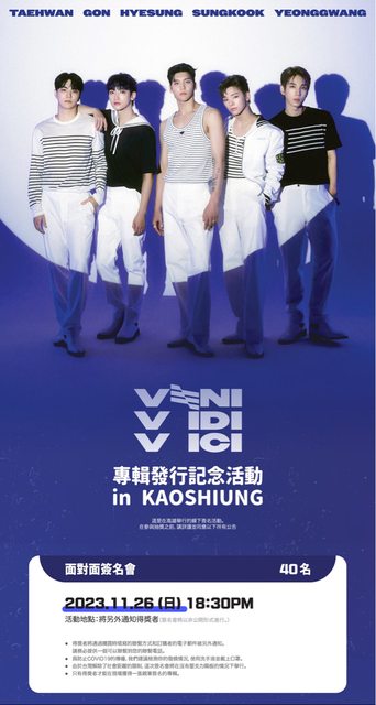 VANNER VENI VIDI VICI 專輯發行紀念活動 in KAOSHIUNG 活動日期:11/26(日) 18:30PM 活動預購期間:11/8(三) 15:00~11/15(三) 23:59 得獎發表日期:11/20(一) 15:00後 個別通知得獎者 面對面簽名會 40名 限定活動特典 -自拍小卡 追加粉絲福利 -親簽拍立得 -Q&A 活動詳情 K-MONSTAR https://reurl.cc/Zyvx6A -- ※ 發信站: 批踢踢實業坊(pttsite.org.tw), 來自: 110.28.1.140 (臺灣) ※ 文章網址: https://pttsite.org.tw/KoreaStar/M.1699427315.A.EF9