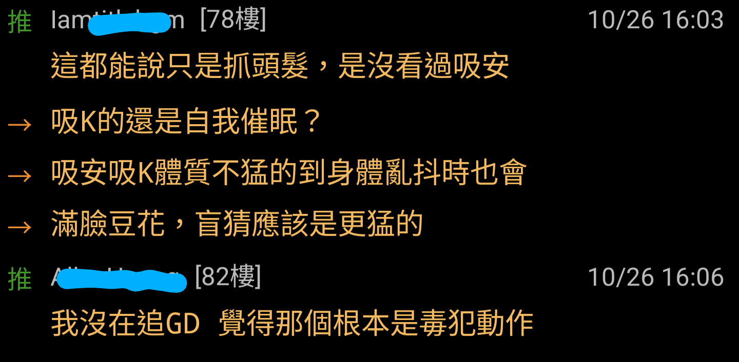 → chiyuri: 給個參考,用MOPTT看,GD被爆吸毒那篇MOP 118.171.199.1 11/20 22:27