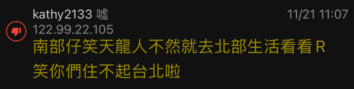 噓 kathy2133: 南部仔笑天龍人不然就去北部生活看看R 122.99.22.105 11/21 11:07