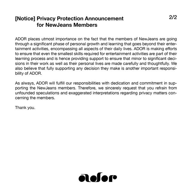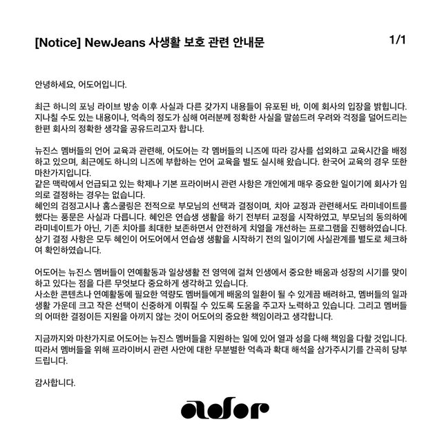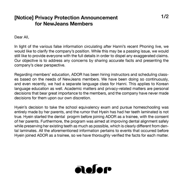 大家好,這裡是ADOR 最近Hanni的Phoning直播,各種與事實不符的訊息被傳播,因此我們想澄清公司的立場。雖 然這可能是個暫時的問題,但我們還是想提供大家完整的細節,以消除任何誇大的說法。我 們的目標是透過分享準確的事實並在提出問題同時也分享公司的準確想法。 對於NewJeans成員的語言培訓,ADOR根據每位成員的需求聘請講師並分配培訓時間,最近還 單獨進行了滿足Hanni需求的語言培訓。韓語教育也是如此。 學術事務和隱私相關事務,成員非常重視個人的決定,公司從未自行為成員做出決定。 Hyein的學歷資格考試和在家上學完全是她父母的選擇和決定,有關她矯正牙齒的傳言並不 屬實。 Hyein在開始練習生生涯之前就開始了矯正治療,在父母的同意下,她接受了一項安 全改善牙齒排列的療程,同時盡可能保留現有的牙齒。上述所有決定均發生在Hyein開始作 為ADOR練習生生活之前,這些事情已被徹底核實確認。 ADOR認為,無論是在偶像活動中,還是在日常生活的各個領域,NewJeans成員正在經歷人生 中重要的學習和成長時期,這比什麼都重要。 ADOR正在努力確保即使是偶像活動所需的最小技能也能成為她們學習過程的一部分。並努力 幫助成員在工作和生活中謹慎做出大大小小的決定。我們相信,為我們的成員所做的任何決 定提供全力支持是ADOR的重要責任。 ADOR將一如既往地履行我們的責任,盡心盡力支持NewJeans成員。因此,我們懇請您不要對 隱私相關問題進行胡亂猜測和過度解讀。 謝謝! 以下為韓網對這聲明的反應 https://bit.ly/3SRe3tK 留言: 1.哇!真的是從頭到尾都是謠言,理直氣壯說這些的人去哪了? 2.不要對小孩子發脾氣了,努力追求自己夢想的孩子有什麼錯?支持那些孩子的粉絲又有什 麼錯?公司立場聲明看了很痛快!NewJeans 公司很照顧孩子們 3.真是羨慕啊!公司真能幹! 4.能感受到經紀公司那邊把成員當女兒,想和藝人溝通,為什麼要胡亂猜測呢? 5.那就再做一次起訴公告吧!完美! 6.裝作擔心未成年人,卻對未成年人散布謠言、惡意留言、胡言亂語,這些人只是偽善者 7.都起訴吧! 8.拜託不要再欺負孩子們了,裝作對她們好,都對孩子們說些甚麼呢? 9.不是!把奇怪的謠言當作事實到處亂說的人到底是什麼?精神病患者吧? 10.好像有對所屬公司閔熙珍有惡意的人,他們才是利用NewJeans的人! -- 有研究指出 看見偶像可以續命 不過偶像遇見粉絲又何嘗不是如此呢?? https://i.imgur.com/EaRAnGu.jpg