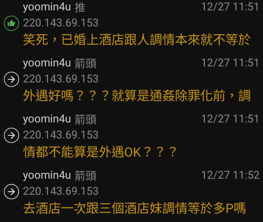 → chinlinw: 愛外遇的可不是y大呢,倒是你對她針對 180.217.247.64 12/28 18:20