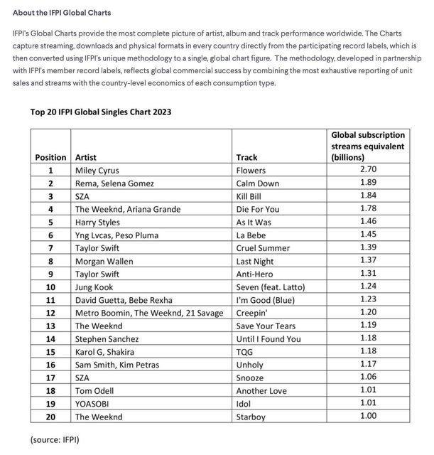 IFPI 國際唱片協會2023全球年度暢銷單曲榜Top20