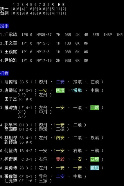 台鋼 |0|0|0|0|4|0|0|0|0|4|11|1|