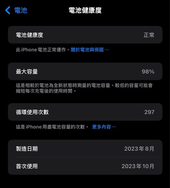 電池健康度98% 使用次數 298次
