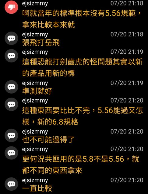 然後持續在6.8mm彈藥的議題上跳針。不過ejsizmmy好像還沒回答共軍何時採用6.8mm制式