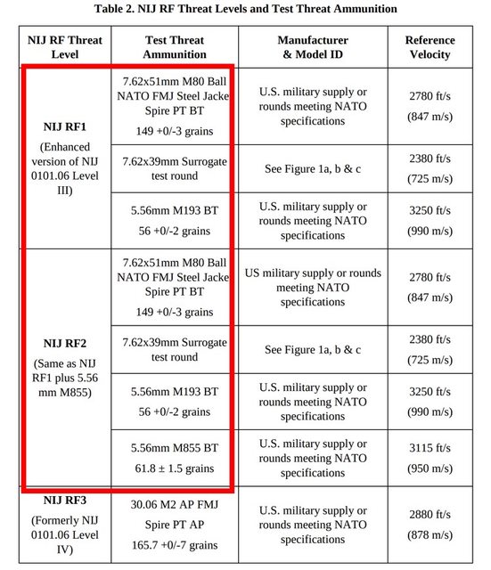 增加了5.56x45 M193以及7.62x39彈藥測試。而RF2標準則再增加5.56x45 M855彈藥,後來