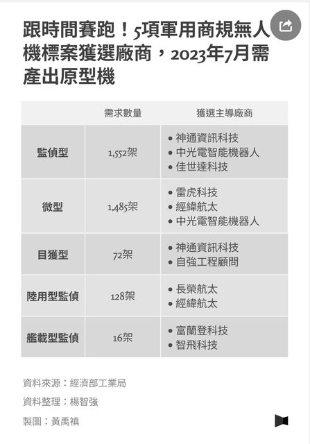 聯合報更新軍用商規無人機採購數量達到1980架,五種皆有採購