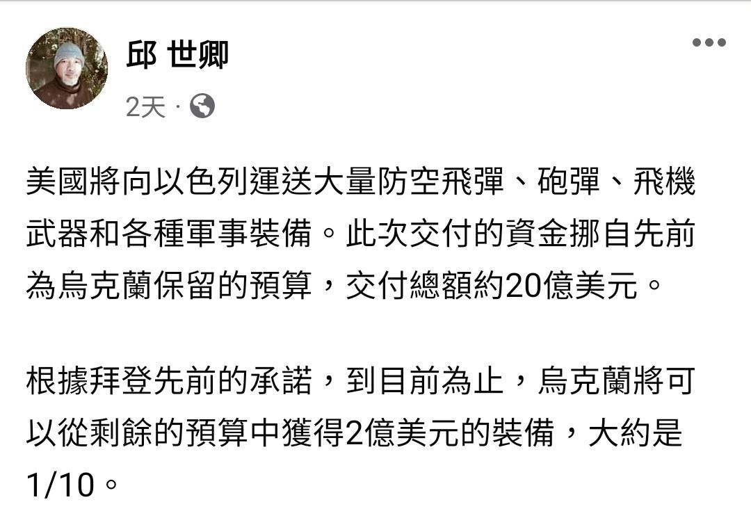 → Yanrei : 說以色列的軍援是挪自烏克蘭的部分,有點搞不太清10/13 21:08