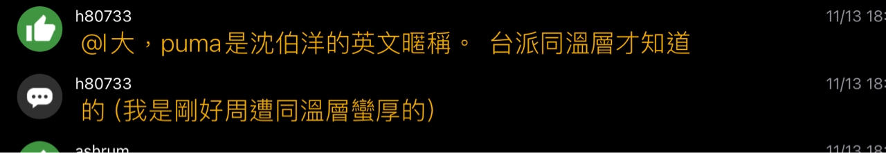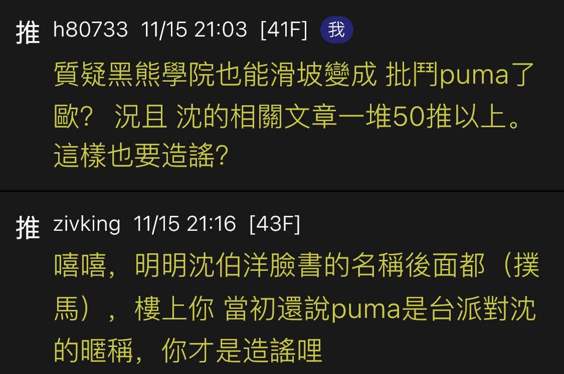 推 h80733 : 前面我說 puma 是指沈伯洋 台派才知道。你要滑坡成 11/15 22:00