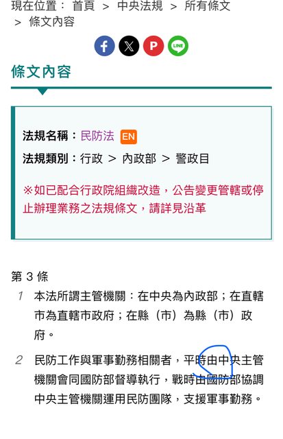 噓 h80733 : 民防法不熟嗎? 民防工作與軍事勤務相關者,平時由 11/22 21:43
