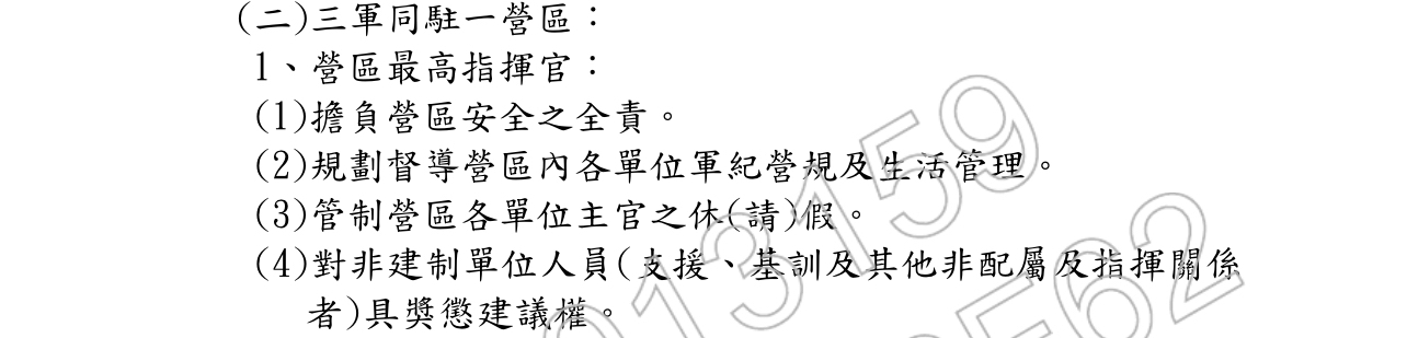 (一)三軍同駐一營區,由最高指揮官負營務營規管理之責,對
