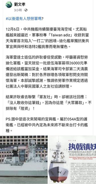 → jobli : 及「募款捐贈迪化軍艦」等情,海軍司令部今(7)日 12/10 20:23