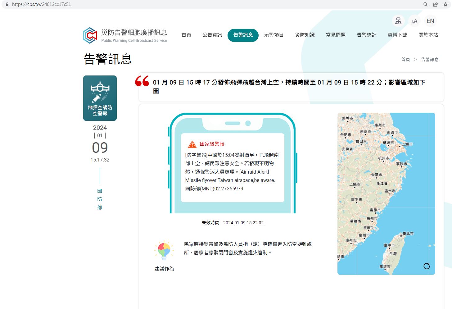 → miHoYo : 該火箭飛行路徑非預警飛越我本島南部上空,高度位於 01/09 20:34