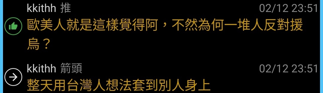 → LI40 : 所以要回答美國援烏民調高的時候怎麼就跟你的那串 02/13 00:06