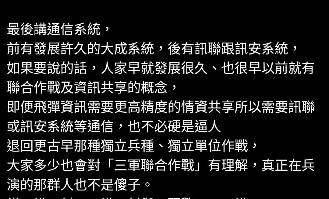 最新的案子說連單兵、單車都要納入資料鏈,中科院規格很敢開,但是沒全面實裝也是
