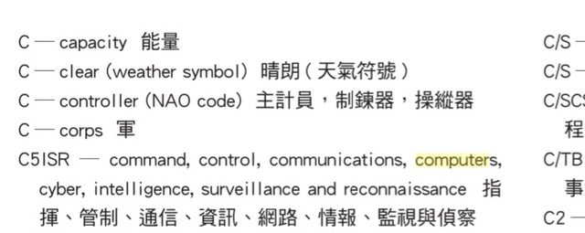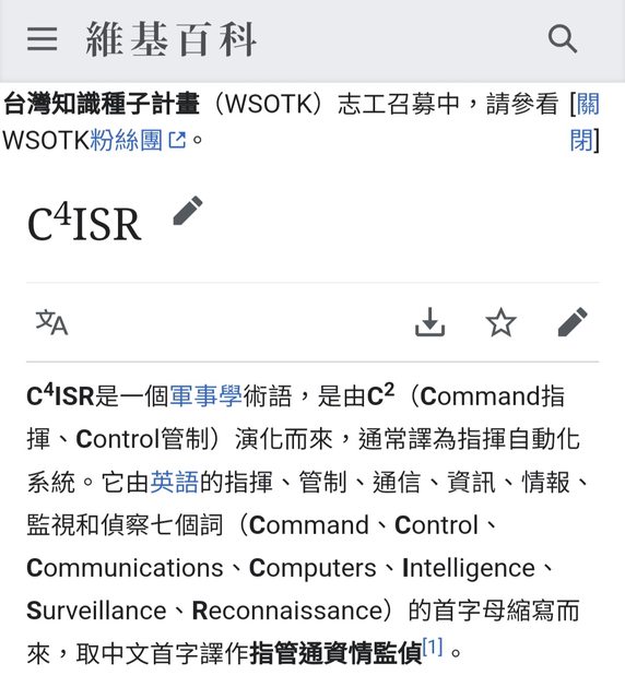 前頭都揭曉過國軍對於C4ISR的中文翻譯名稱了,不要說美華軍語辭典和wiki資料了,Qui
