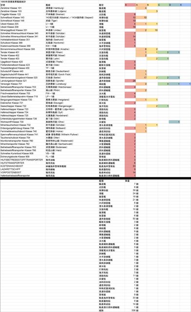 直到1989年為止,西德海軍編制各類艦艇279艘,戰時動員擴增至336艘。在編制艦艇裡面,