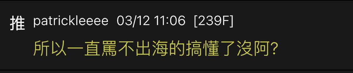 推 patrickleeee: 所以一直罵不出海的搞懂了沒阿? 03/12 11:06