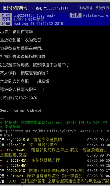 推 godhead : 高雄人調去守金門 哈哈 超爽的 03/13 17:10