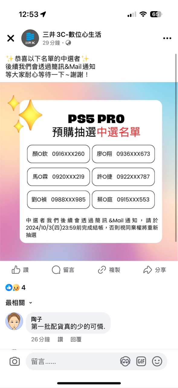 → jforce: 三井3c 剛才有公布 pro 的數量,是六台 09/30 12:40