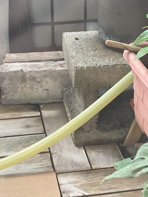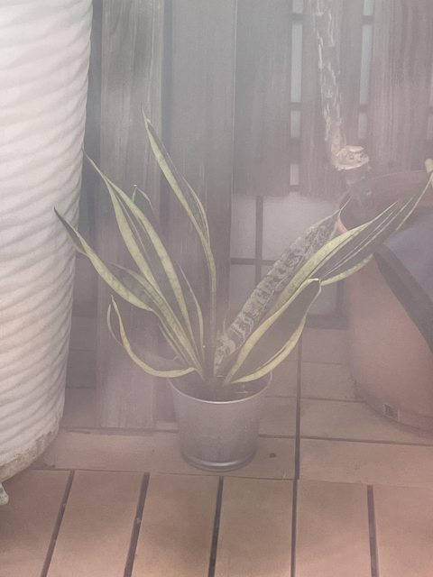 物品名稱:窗孔龜背芋、虎尾蘭、水泥空心磚、不知名植栽一盆
