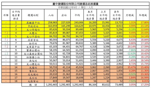 標題Fw: [情報] 台中捷運113年9月各站旅運量