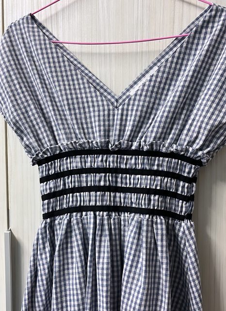 7. V領包肩鬆餅格紋洋裝-藍粉,售350