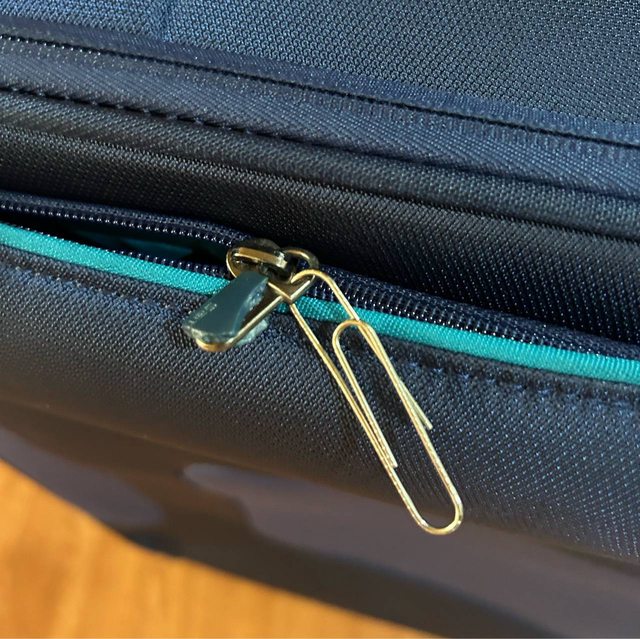 前方小分隔袋的拉鍊板為塑膠,因疫情多年未出過,它膠化黏黏斷裂,但用迴紋針套上,