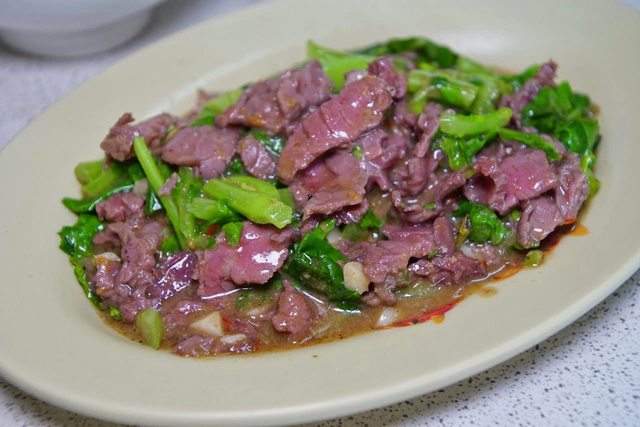 芥藍牛肉,由芥藍菜和新鮮牛肉片經過大火快炒而成,上桌時仍保持著粉紅色的外觀,肉