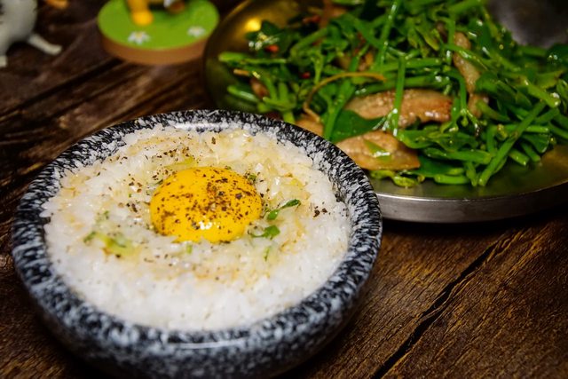 月見鹽蔥飯,以日式鹽蔥調味,搭配生蛋黃直接蓋在白飯上,吃得時候將月見與鹽蔥拌勻