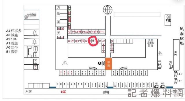 ▲攤商曝光現場位置圖,文創市集擺在圖中央的紅色數字區,對比操場旁兩邊 40 多攤的