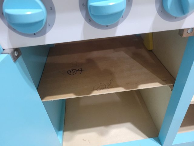 此為二手玩具,附上一些蔬果食物等等玩具,外面有被小孩貼一張巧虎貼紙,廚房內部有
