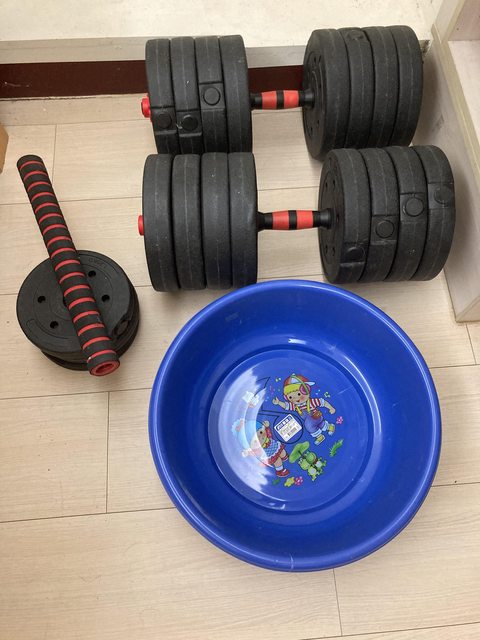 50公斤啞鈴組、1.25公斤槓片x4、連接桿、臉盆
