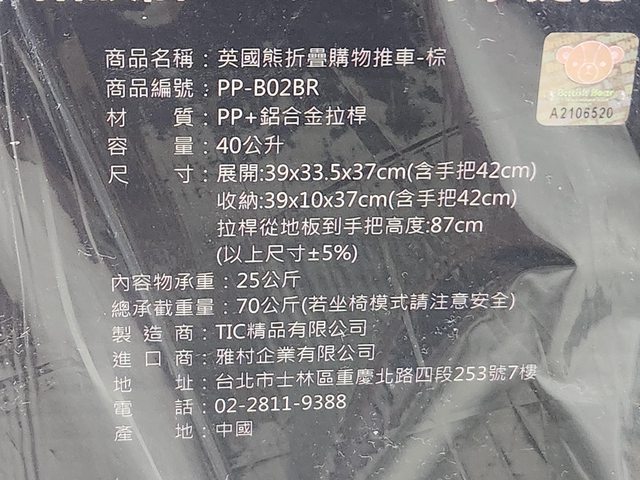 1. 英國熊摺疊購物推車(全新贈送品)