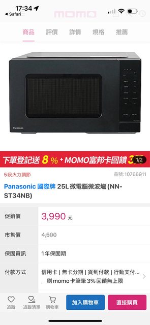 交易類別:出售 Panasonic 國際牌 25L微電腦微波爐(NN-ST34NB)