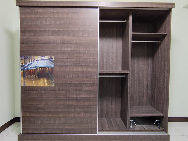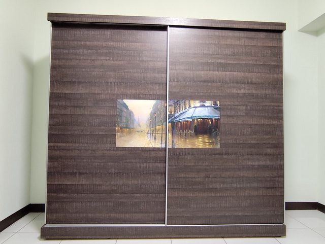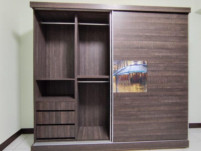 一、7.8尺拉門衣櫃(長231高212深62公分)9成新。可分拆3個桶身、門片上下底板載運