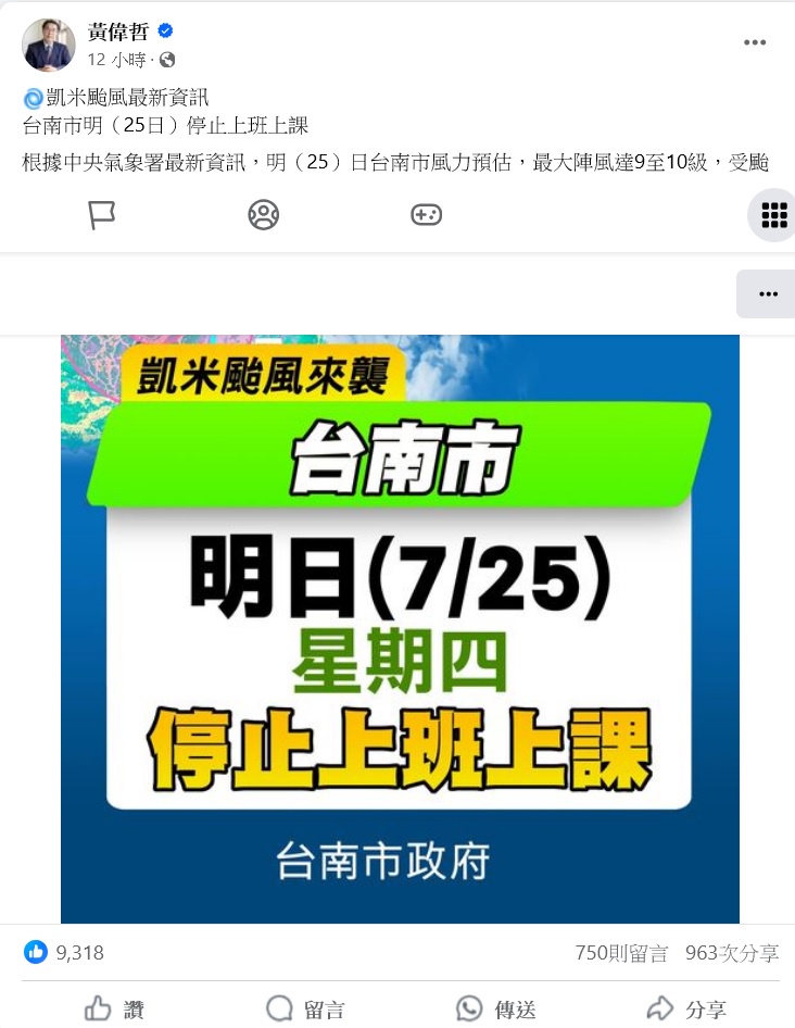 台南颱風假+1!25日停班停課 黃偉哲臉書被灌爆