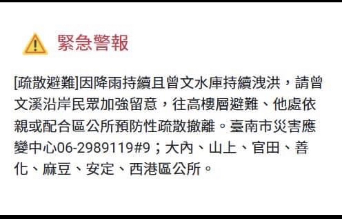 → angelpeace: 善化有小淹吧,我看我同事LM出去採買路上有淹 07/25 19:33