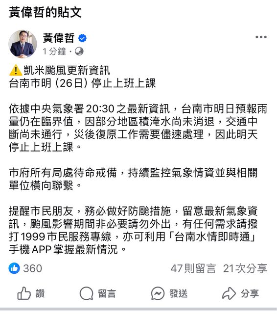 推 KarlMarx: 欸那個,八點的時候台南比高雄早宣布明天正常上班上課 07/25 21:43