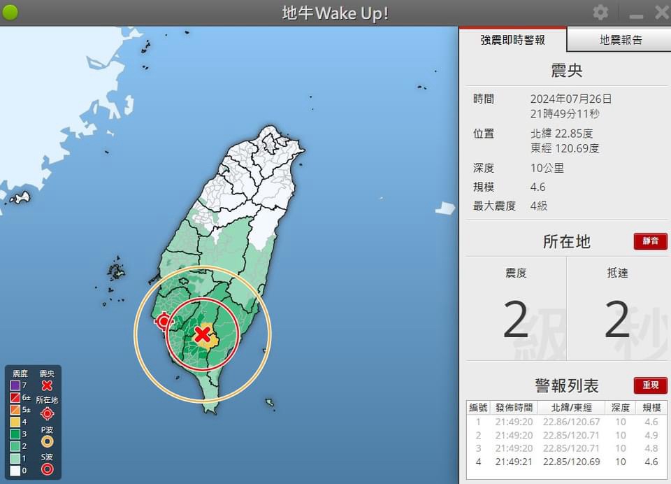→ my1938: 07/26 21:49屏東縣三地門鄉發生第435號有感地震,規模4.6 07/26 21:57