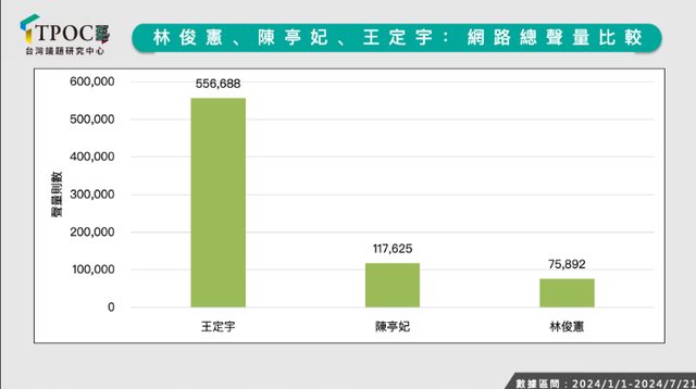 TPOC透過QuickseeK快析輿情資料庫,蒐集今年這三人的網路聲量數據。數據顯示,王定