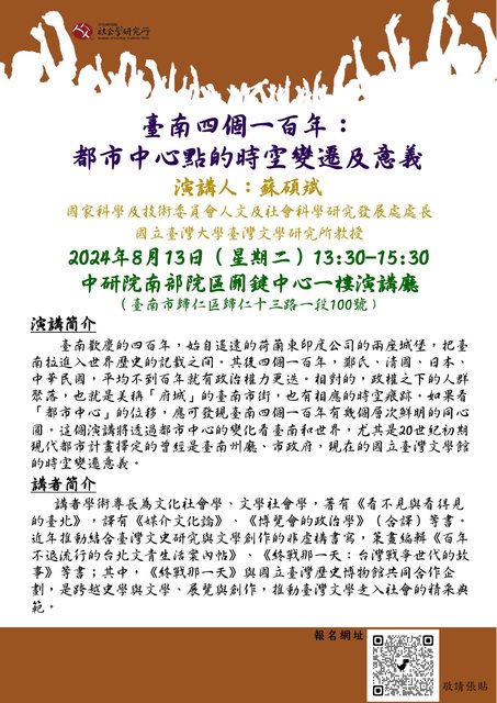 地點:中研院南部院區關鍵中心一樓演講廳(臺南市歸仁區歸仁十三路一段100號)