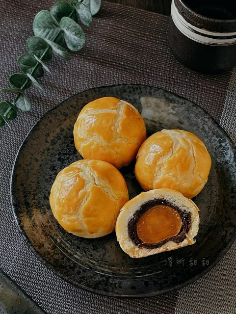內餡使用奶油紅豆餡及紅玉紅茶烏豆沙,包覆整顆大顆的鹹蛋黃,